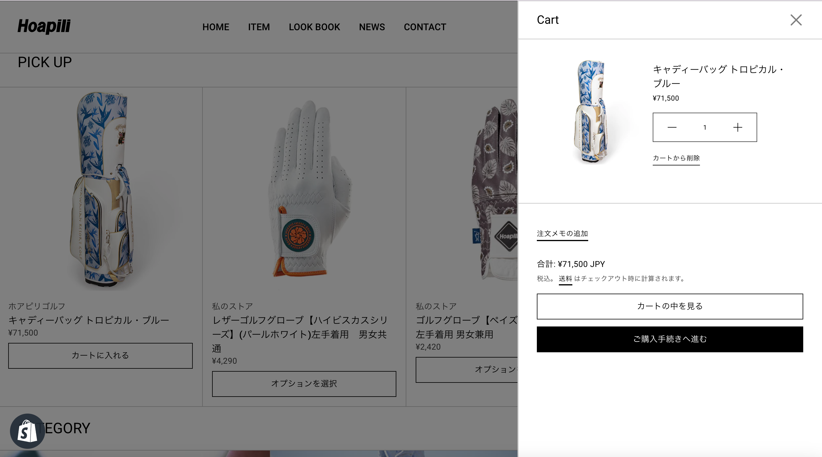 ご希望商品を選択後カート画面に移ります。数量を変更したい場合は希望の数量を「+,−」ボタンで指定してください。買い物を続けたい場合は右上の「×」ボタンをクリックしてください。
